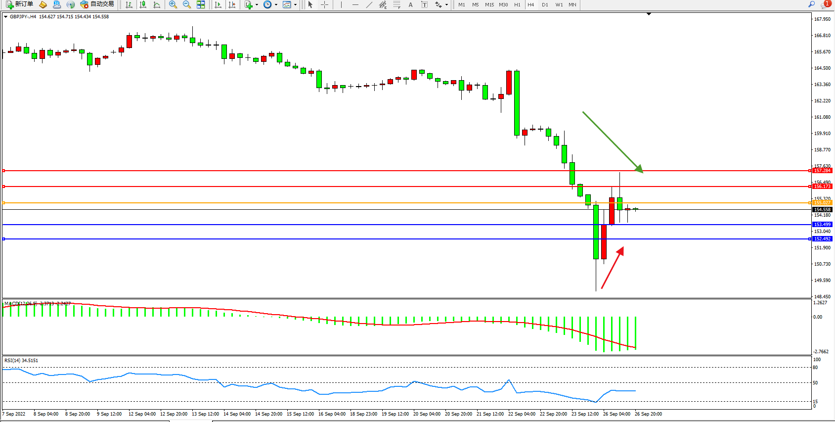 英镑日圆GBPJPY——4小时K线图显示: