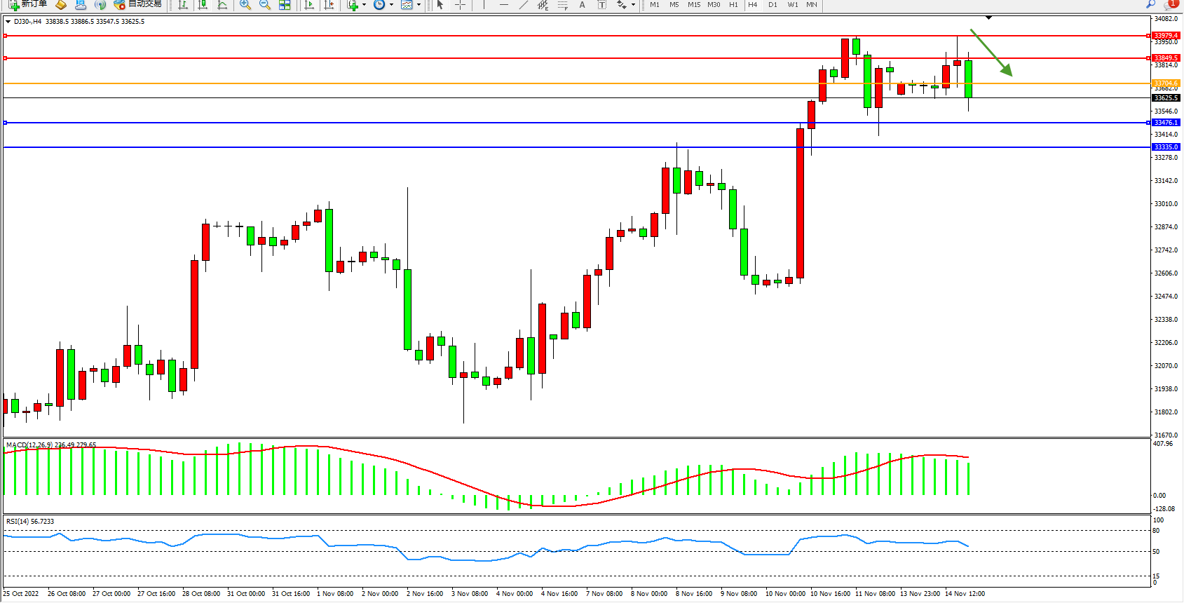 道琼斯指数11月14日(周一)收盘下跌211.16点,跌幅0.63%,报33536.70点;芝商所的“联储观察”工具最新显示,美联储在12月会议上至少加息50个基点,但连续第五次加息75个基点的可能性不到20%。