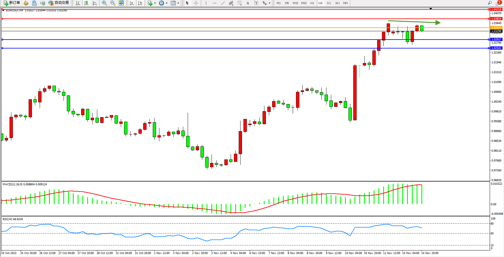 欧元兑美元维持1.03281附近震荡,欧元兑美元已大幅上涨,欧元兑美元料在12月初之前升至1.05。尽管如此,市场仍预计三个月后欧元兑美元将跌至0.97。美联储明年加息的幅度可能超过我们和市场目前的预期。欧元和美元之间的息差可能会有打压欧元兑美元走低。