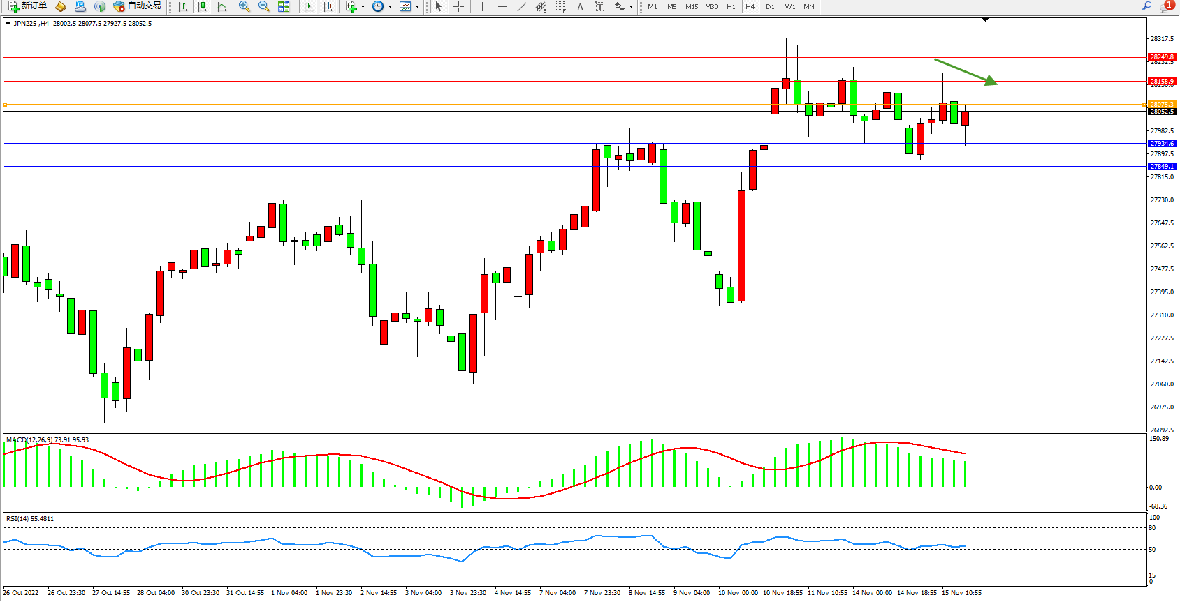 日经225指数11月15日(周二)收盘上涨36.03点,涨幅0.13%,报27999.50点。日本第三季度实际GDP年化季率初值 -1.2%,预期1.1%,前值3.50%。第三季GDP意外萎缩,受通胀飙升和全球经济放缓拖累;全球通胀和经济衰退的风险飙升、日元疲软以及全球性加息,破坏了日本经济在疫情后的复苏。