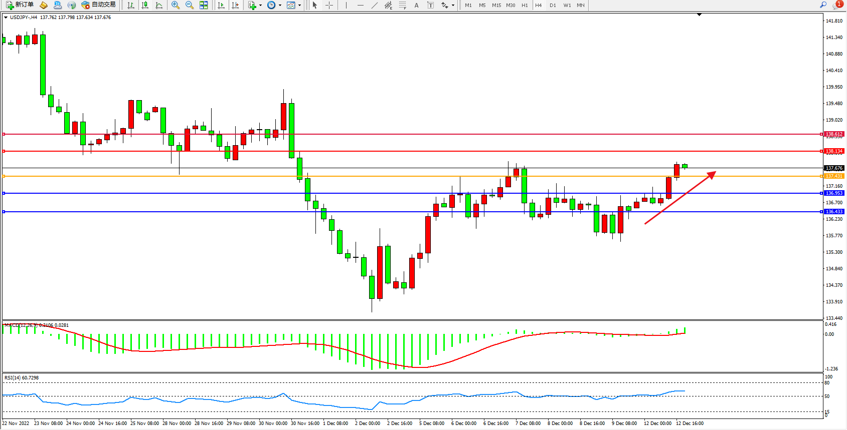 交易策略:137.431上方看涨,目标138.134、138.612