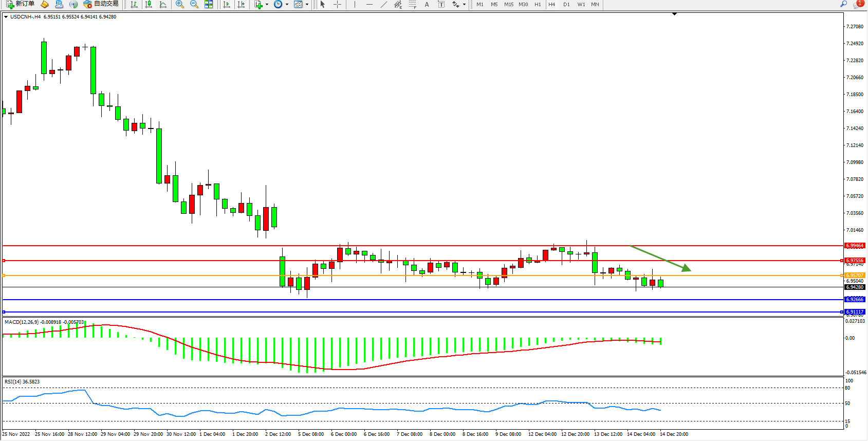 交易策略:6.95707下方看跌,目标6.92666、6.91117