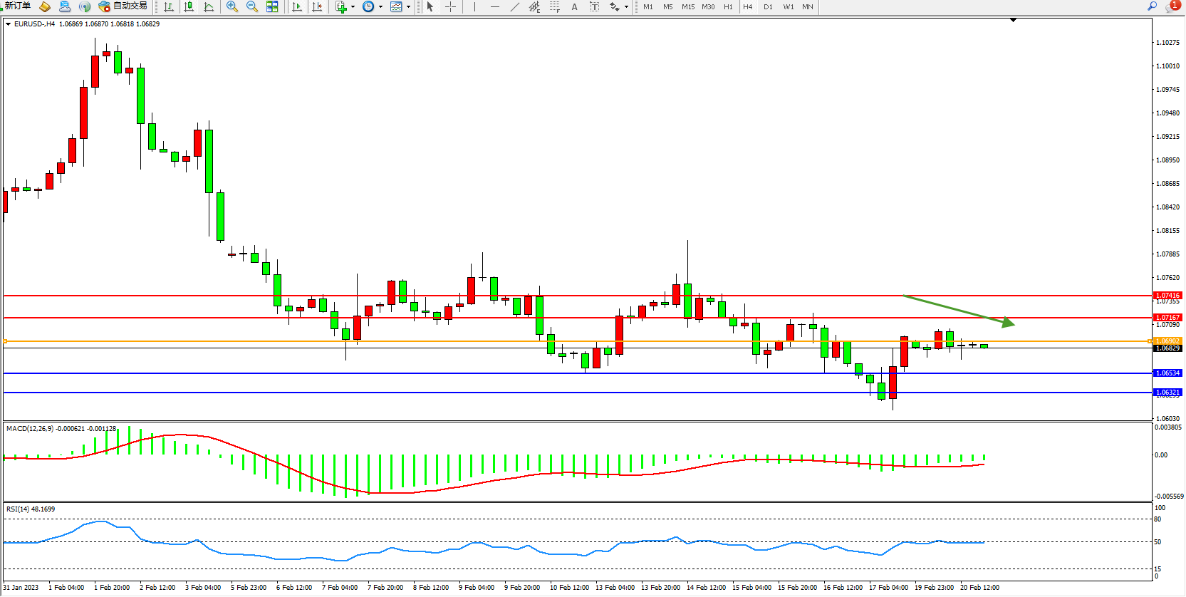 交易策略:1.06902下方看跌,目标1.06534、1.06321