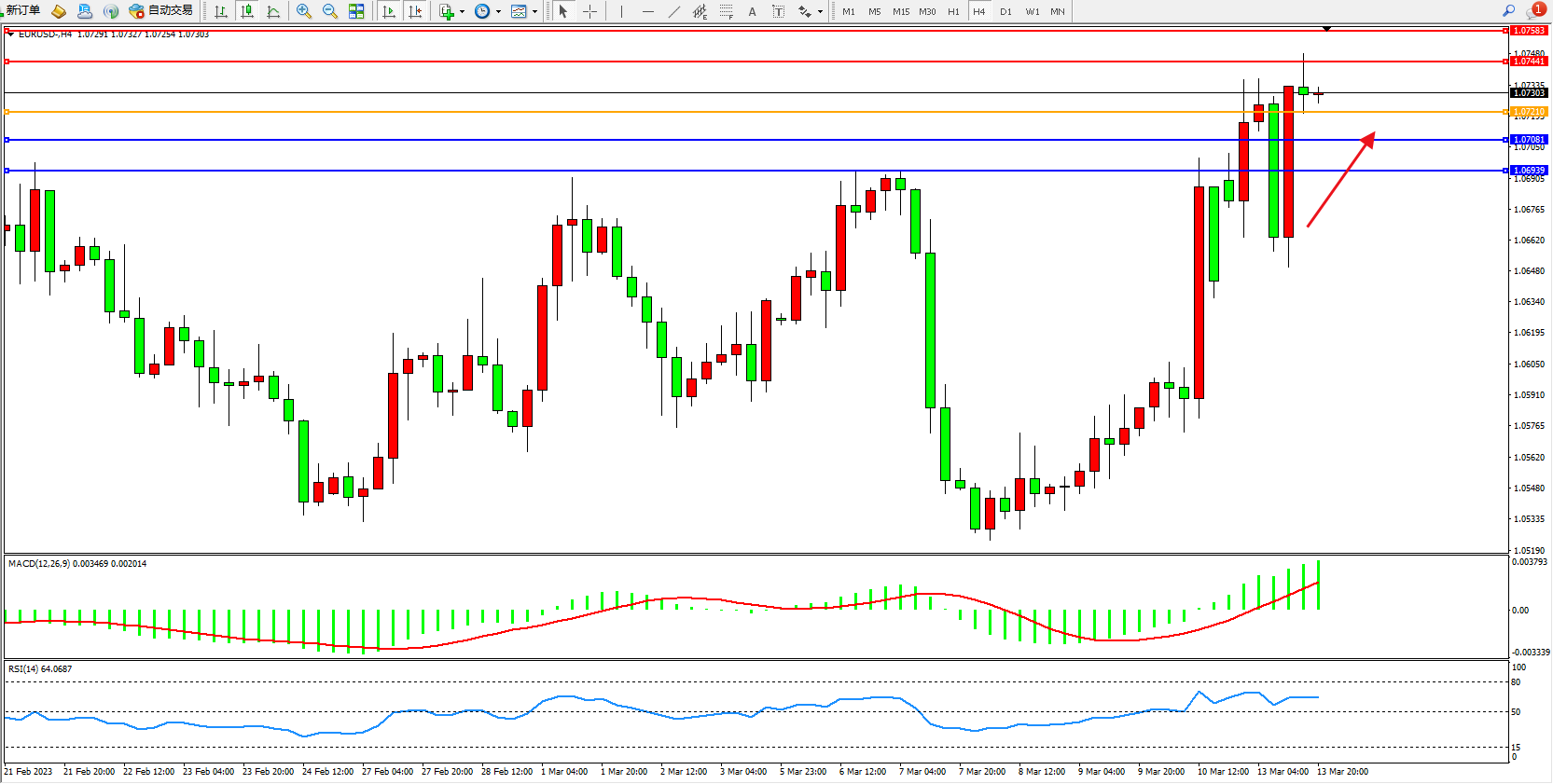 欧元兑美元维持1.07203附近震荡,欧元区的通胀书评放缓不及预期,2月核心通胀率由1月的5.3%升至5.6%,达到历史新高。结合欧央行在加息上表达出越来越鹰派的倾向,交易员押注欧央行将继续加息至有纪录以来的最高水平。