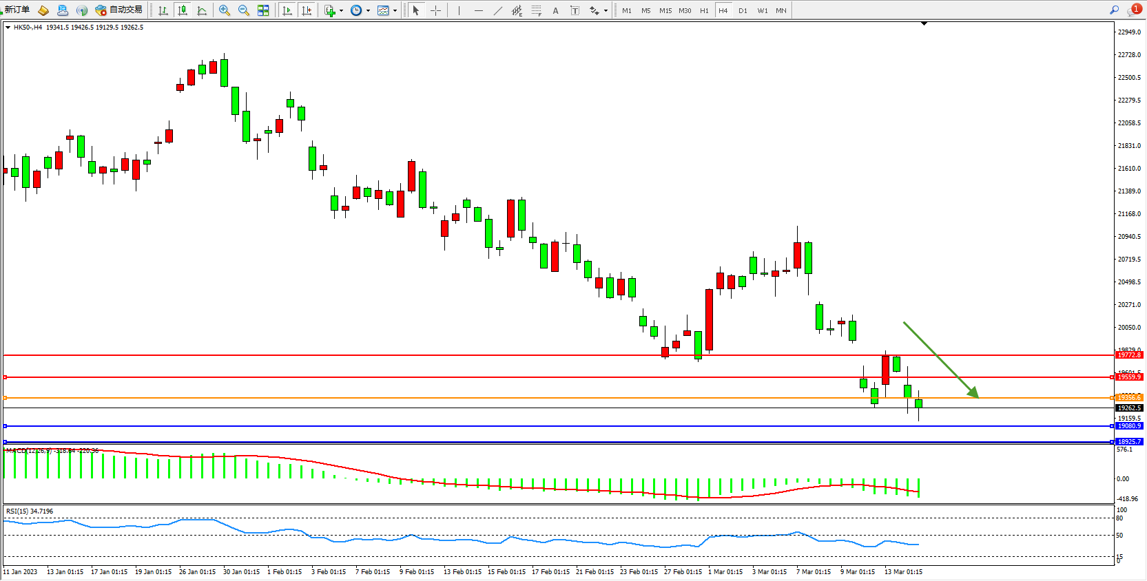 香港恒生指数3月14日(周二)收盘下跌448.01点,跌幅2.27%,报19247.96点;美银行暴雷影响继续,港股午后跌幅进一步加大,恒生科技指数一度跌超3.2%,最终下跌2.59%,恒指、国指分别跌2.27%和2.29%,三者皆抹平昨日反弹涨幅。受美银行股影响,港股银行股集体下挫,香港本地银行股跌幅较大,南下资金逆势净流入52.34亿港元,大市成交额为1308亿港元。