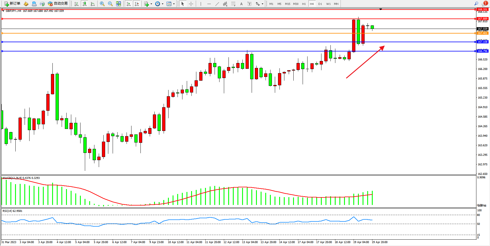 交易策略:167.401上方看涨,目标167.889  168.201