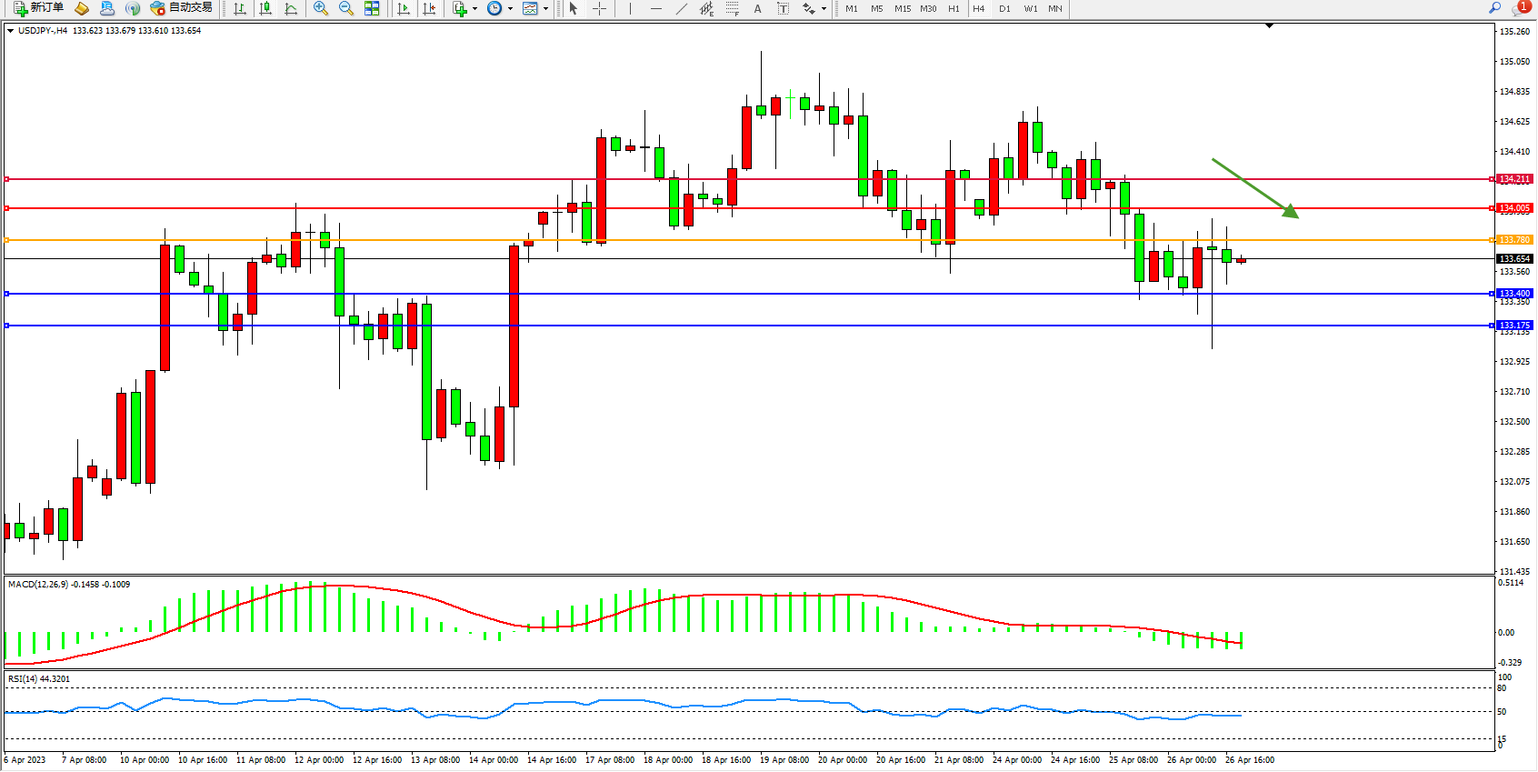 4小时图看:高位空头动力维持震荡下移,短期空头情绪依旧,市场有进一步向下移动迹象,MACD指标处于0轴线下侧徘徊,RSI指标处于50均衡线下侧弱势整理;