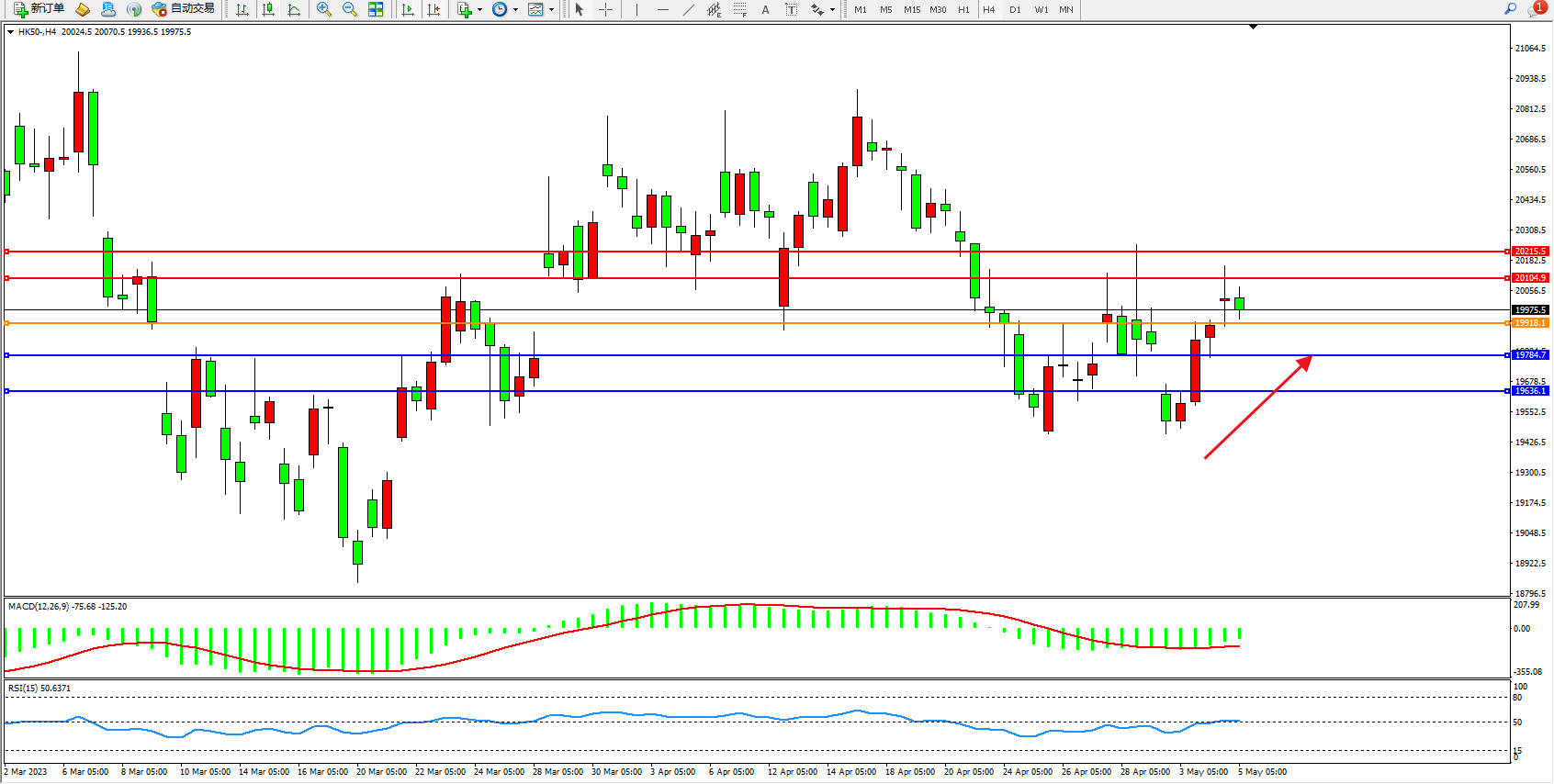 香港恒生指数5月5日(周五)收盘上涨100.58点,涨幅0.5%,报20049.31点;美国地区银行股暴雷影响趋于平静,港股三大指数全天维持涨势,恒指涨0.5%重回2万点上方,国指涨1.18%,恒生科技指数涨1.03%。香港3月零售销量同比升39.4%胜预期,经季调后,环比升幅扩至6%,高于2月的3.6%;并属疫情以来经季调零售销量首次恢复至2019年12月水平。首三个月零售销量同比升22.3%,远多于去年末季的0.4%升幅。南下资金全日净流入8.09亿港元,大市成交额不足千亿港元。