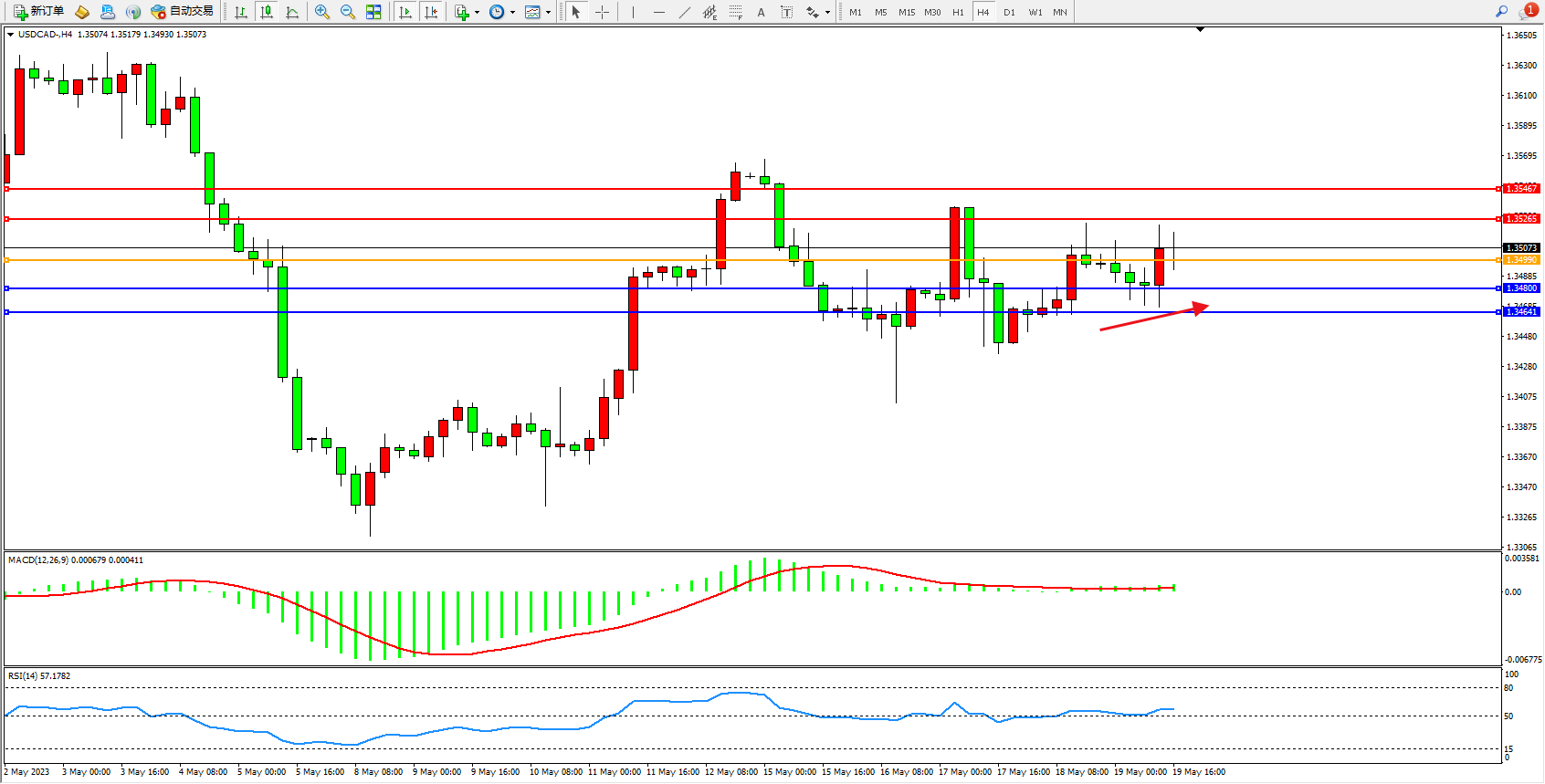 4小时图看:短期多头动力维持阶梯式震荡向上移动,短期看涨情绪持续,MACD指标处于0轴线上側弱势徘徊,RSI指标处于50均衡线上側弱势整理;