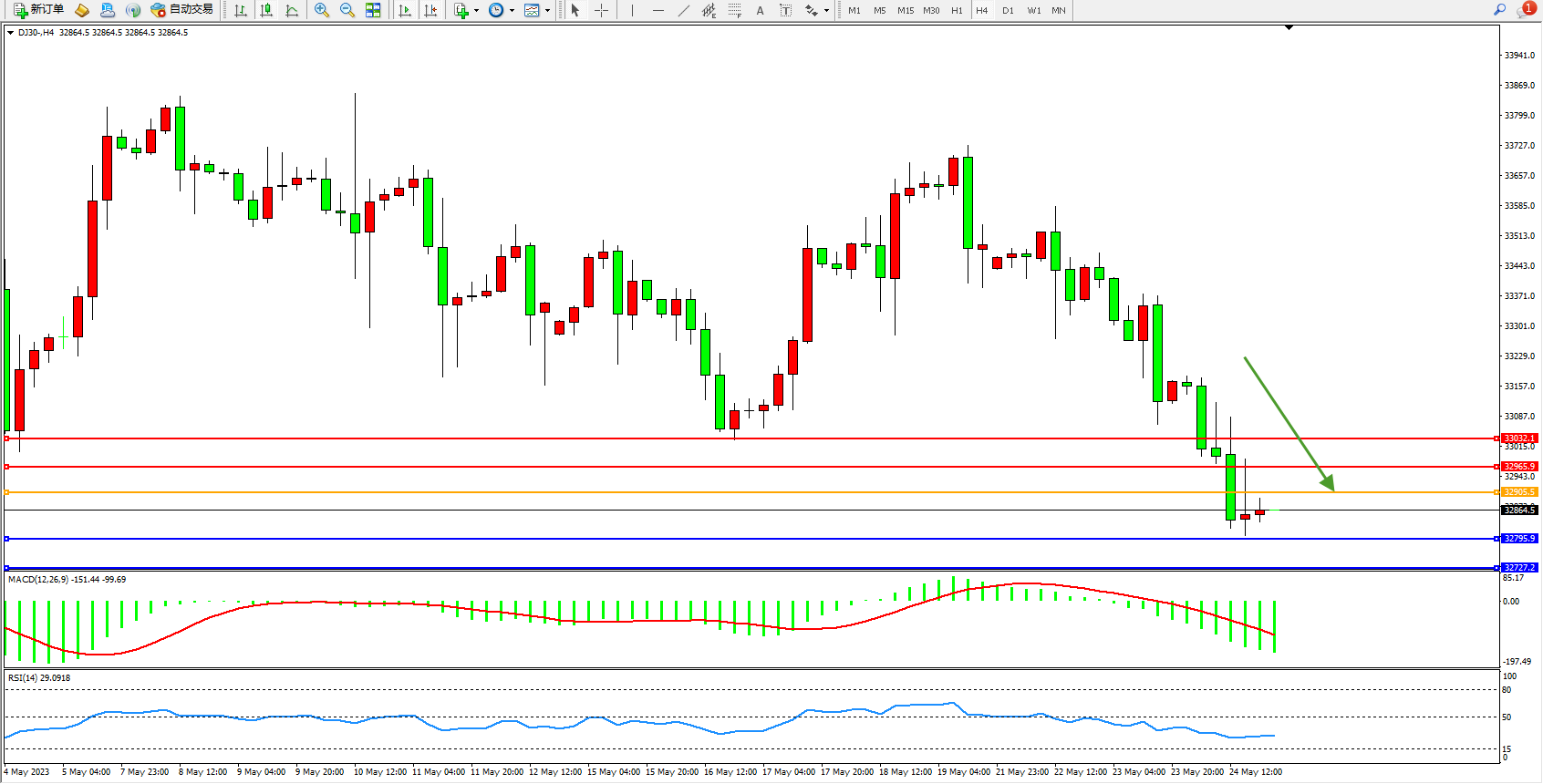 道琼斯指数5月24日(周三)收盘下跌255.13点,跌幅0.77%,报32800.38点;美国财长耶伦:财政部可能在6月1日之前用尽现金,很难确定资金耗尽的具体日期,将把6月初作为债务上限违约的最后期限,不久将向国会通报政府财政状况,拜登承诺美国不会违约非常重要。