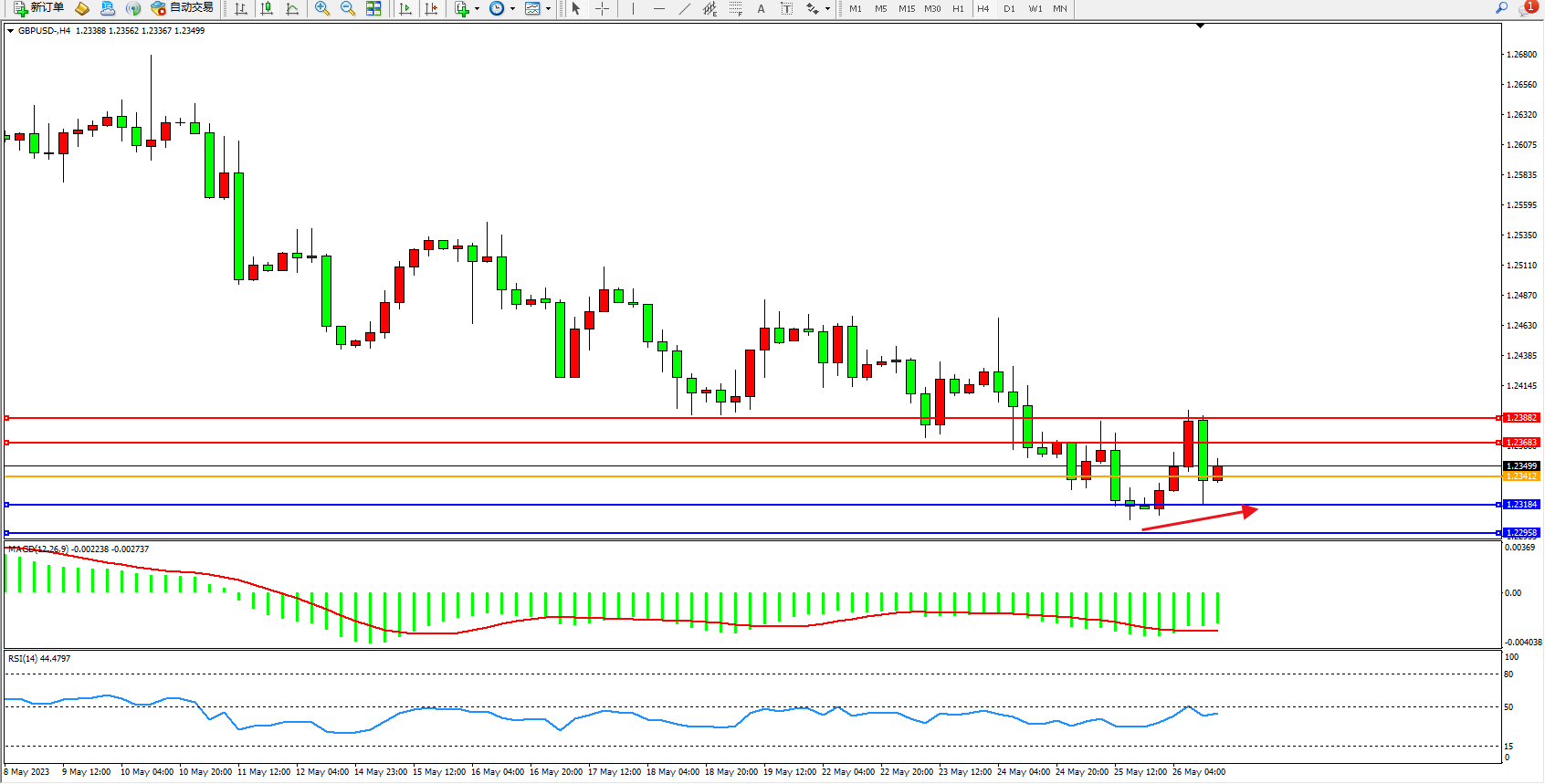 4小时图看:高位多头动力持续攀升,短期看涨情绪持续,市场多头尚未有止步迹象,MACD指标处于多头区域持续上行,RSI指标处于高位整理;