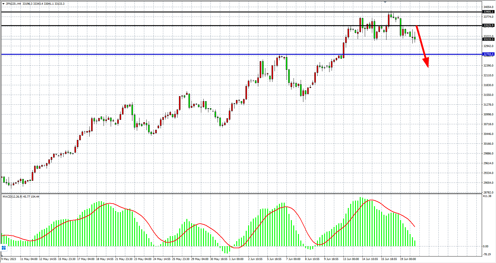 4小时图看,日经指数在33500之下继续走低,MACD量能在零轴上持续缩量,行情进入高位盘整,阻力关注33500,该位之下继续看调整,下方目标看32700-32200。