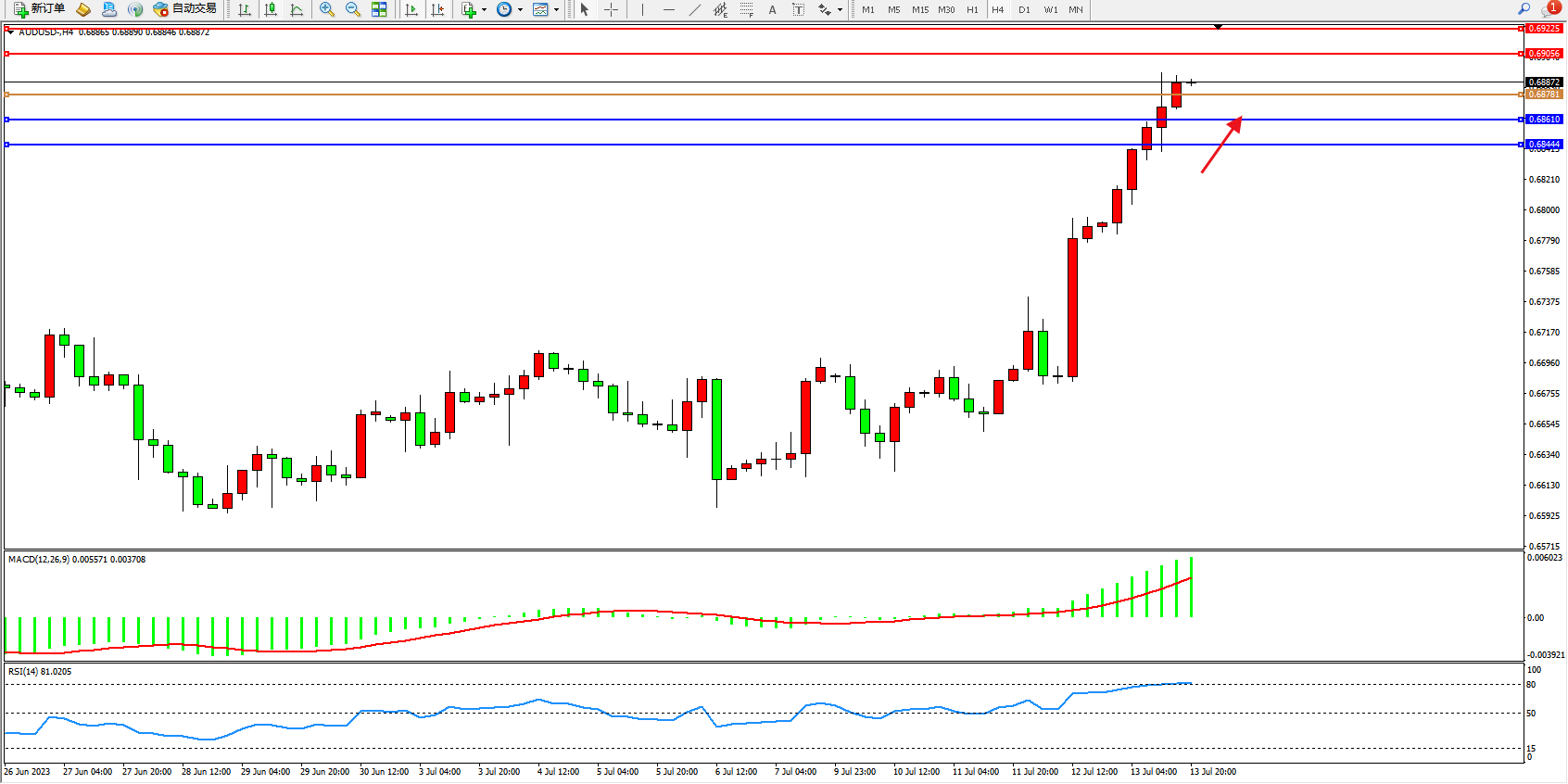 4小时图看:高位多头动力强势拉升上扬,市场看涨情绪笼罩,短期有继续向上移动态势,MACD指标处于多头区域高位上移,RSI指标处于多头区域80均衡线附近徘徊;