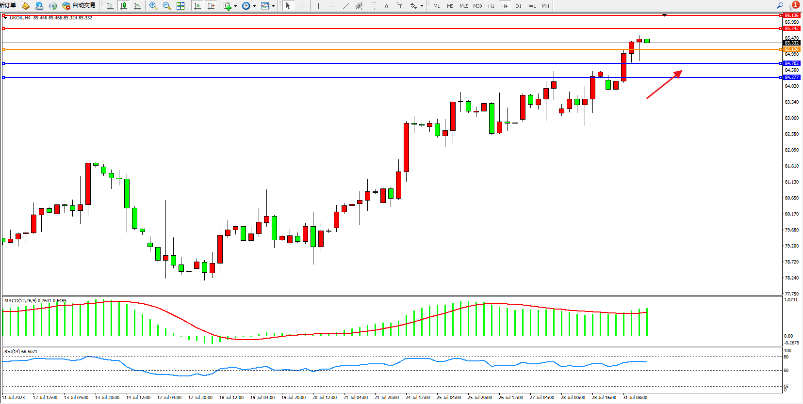 4小时图看:多头动力高位震荡上移,市场看涨情绪笼罩,多头不断上扬,MACD指标处于高位整理,RSI指标处于多头区域高位徘徊;