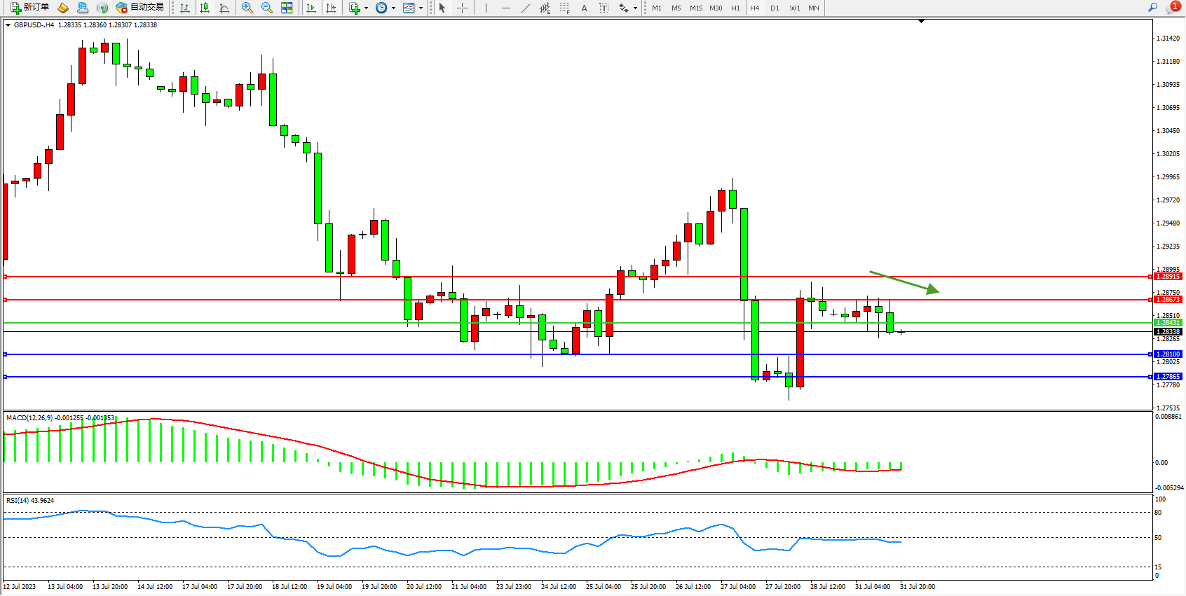 交易策略:1.28431下方看跌,目标1.28100 1.27865
