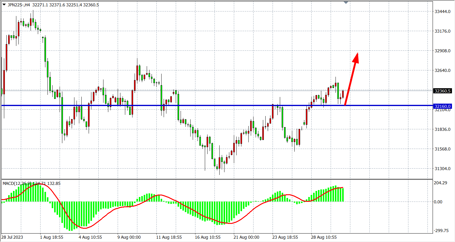 4小时图看,日经指数冲高受阻于32500一线,MACD量能在零轴上维持均匀,阻力继续关注32500附近,支撑关注32160附近。