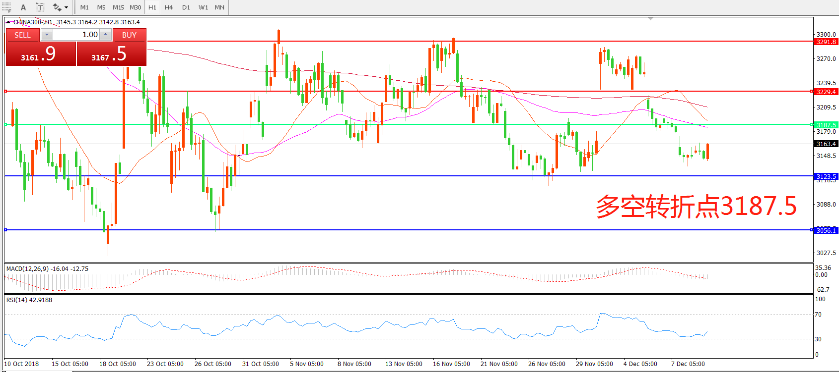 1小时图看,CHINA300中华指数震荡下行,整体价位跌至均线系统之下, MACD红柱增加,RSI直指标有拐头迹象,日内走势以弱势震荡为主。