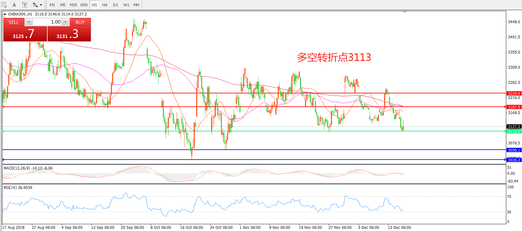 1小时图看,CHINA300中华指数、走势较弱,均线已经完全空头排列,KDJ、MACD指标持续下行,短线继续下探的可能性。