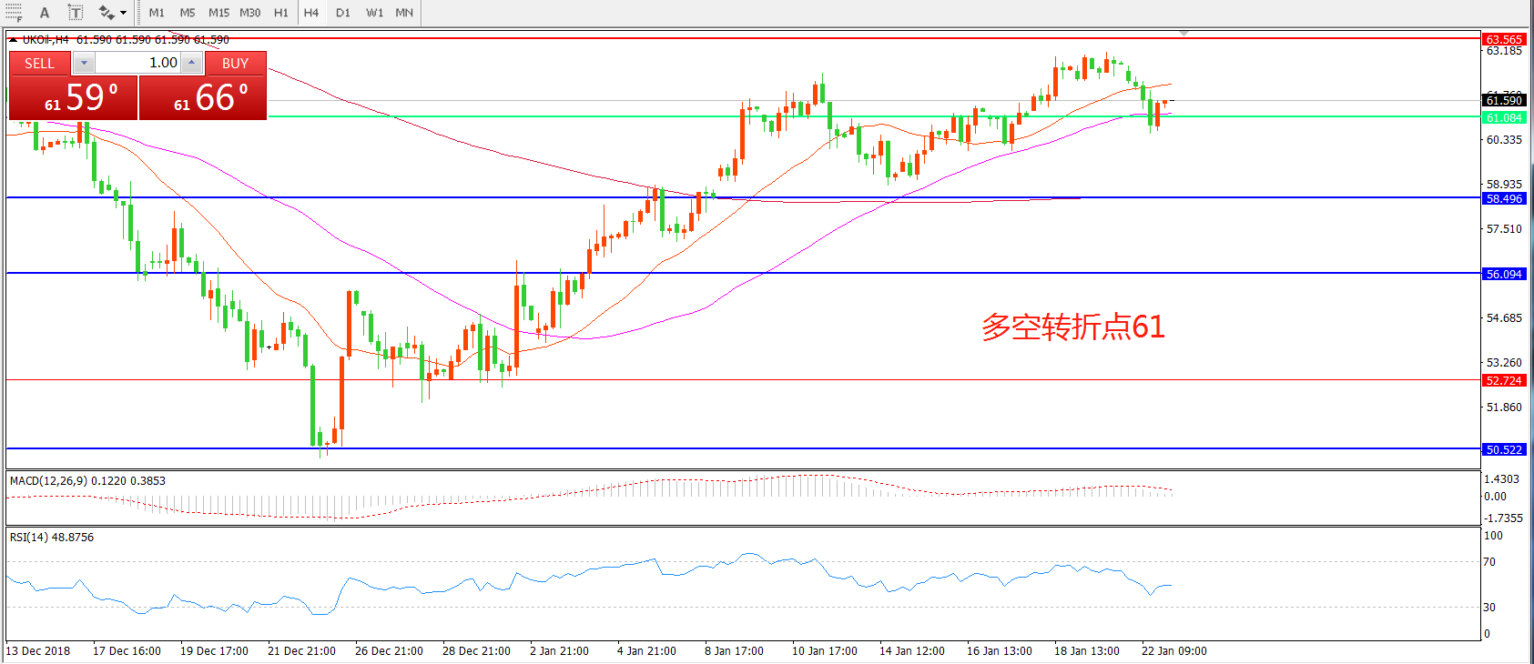 4小时图看,油价经过连续整理站稳61美元,短期整理后受制于63美元关口, 均线系统呈多头排列, MACD红柱增加,重点关注上方阻力。
