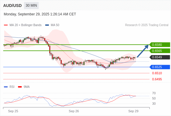 在 0.6525 之上,看涨,目标价位为 0.6565 ,然后为 0.6580 。