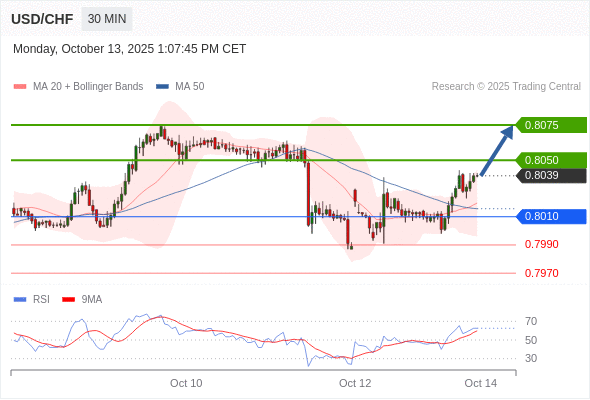在 0.8010 之上,看涨,目标价位为 0.8050 ,然后为 0.8075 。