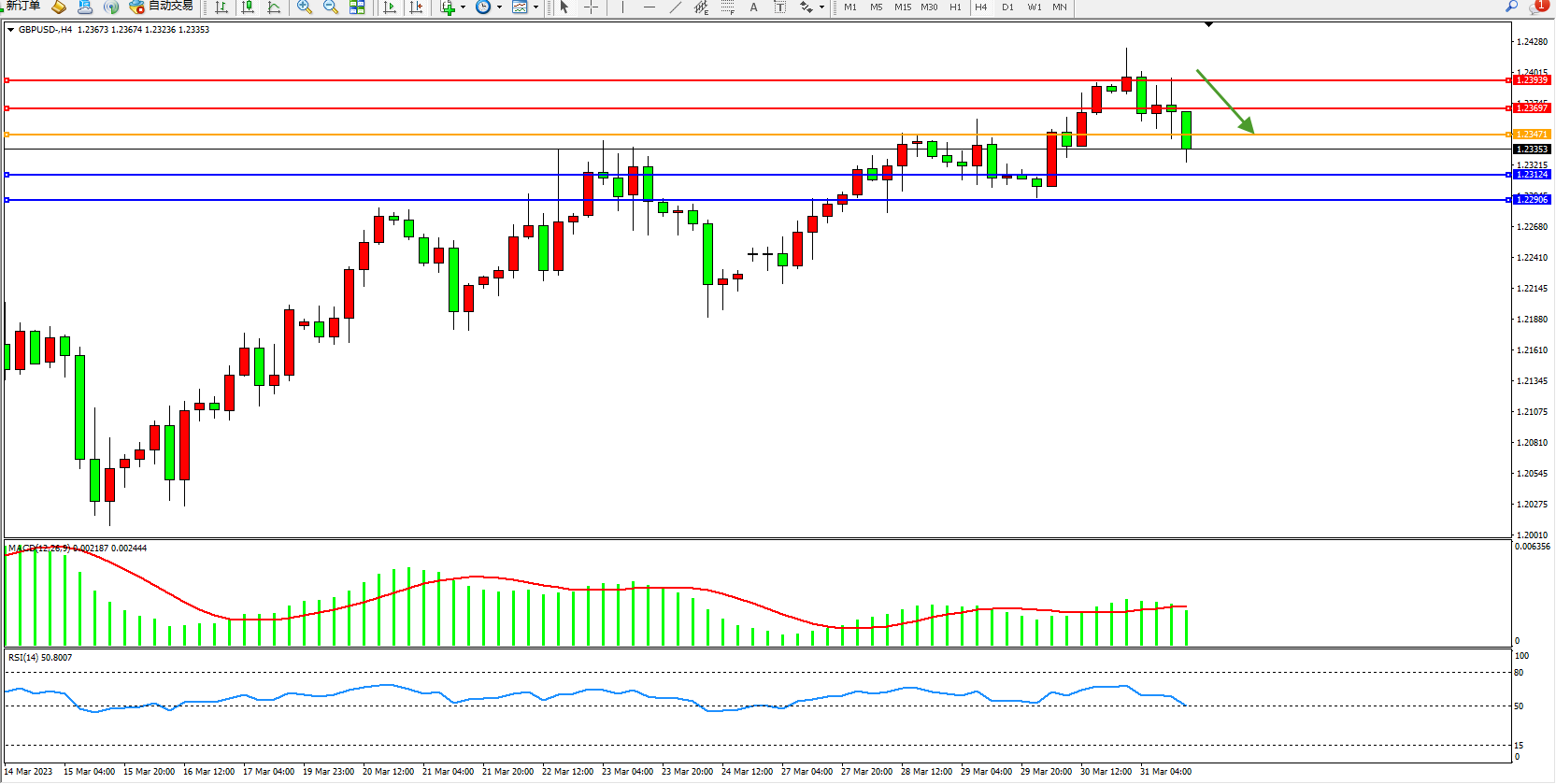 4小时图看:高位空头动力震荡回撤,多头拉升动力减弱,短期空头动力有伺机入场迹象,MACD指标处于多头区域整理,RSI指标处于多头区域震荡下移至50均衡线附近整理;