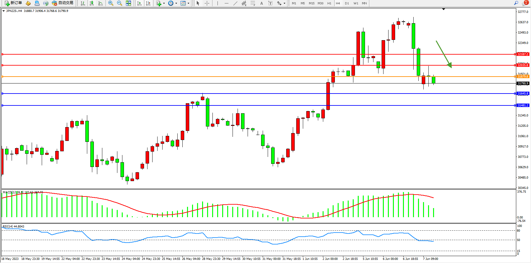 4小时图看:高位空头动力急速下行后整理,市场空头情绪逐渐涌现,短期跌势或将延续,MACD指标维持震荡下移,RSI指标处于50均衡线下侧弱势徘徊;