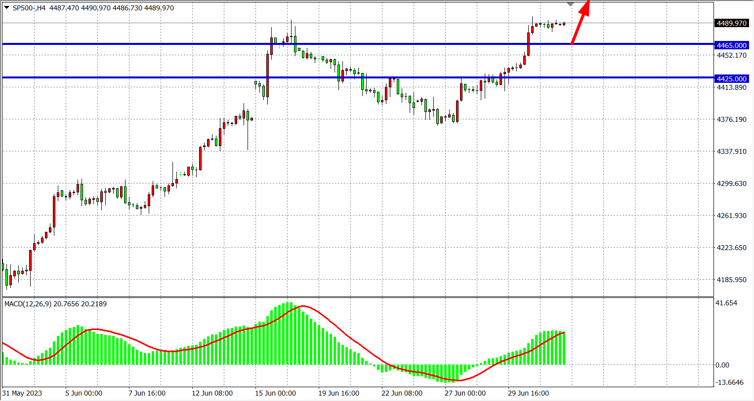 4小时图看,标普进一步走高至前高点4490附近,MACD量能零轴上延续均匀放量,行情延续反弹势头,支撑上移4465,该位之上继续看涨新高。