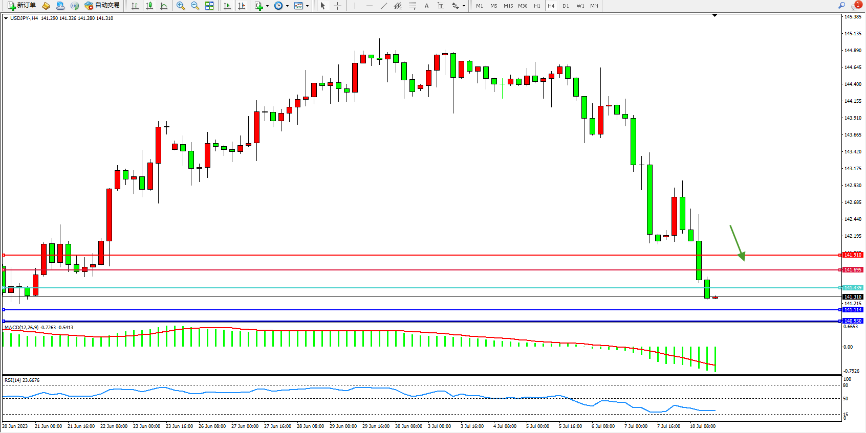 4小时图看:空头动力强势下挫,短期跌势持续,市场整体强势下行,MACD指标处于空头区域强势下移,RSI指标处于空头区域低位震荡;