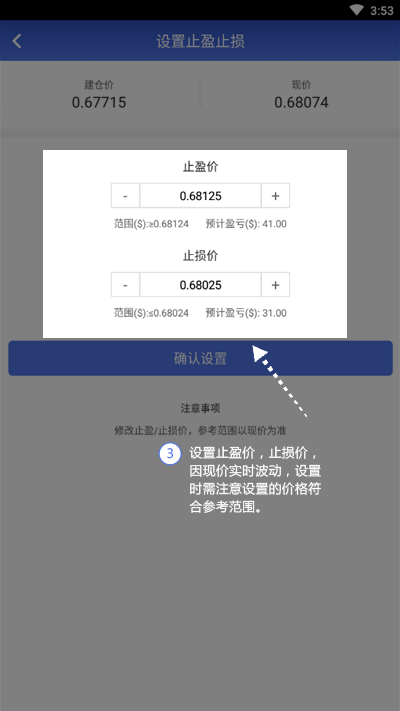 3.设置止盈价,止损价,因现价实时波动,设置时需注意设置的价格符合参考范围