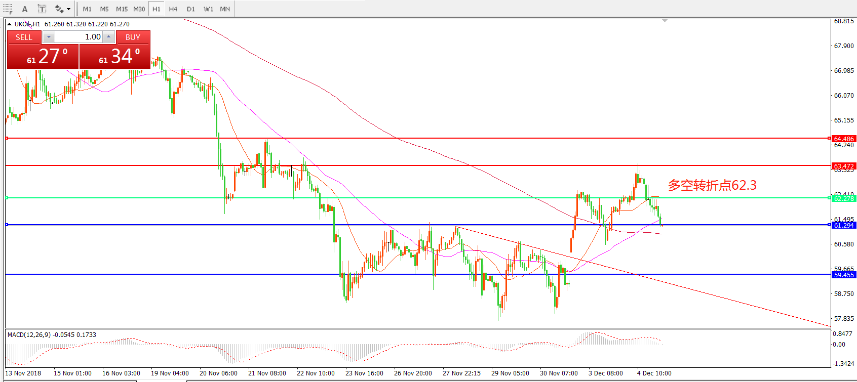 小时图看,油价受G20利好消息影响,跳空高后出现回落,形态上有形成双头走势迹象,短期均线走平,MACD红柱缩短,短期关注下方支撑61.3一线。